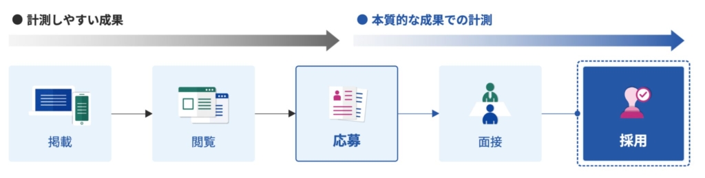 また日本の労働人口が減少する中、応募数の最大化に焦点を当て、採用数を確保するという従来の採用手法が通用しにくくなっています。採用難の時代に、求人広告の効果を「応募数」や「応募単価」ではなく、「採用数」や「応募から採用数への歩留まり」で測る、というSHIFT RIGHTの考え方も合わせて提唱されています。
