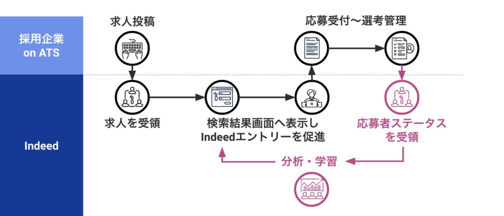 Indeedに送信されたステータス情報は、プロダクト改善に利用され、求職者に対してよりよい検索結果の提供等に活用されます。